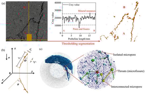 Crack characteristics derived from CT imaging: (a) Sandstone pores/cracks (orange) via threshold segmentation; (b) crack eigenvectors (, , ) and projection angles ( for axial, for vertical); (c) 3D pore–crack network model with equivalent spheres (isolated micropores, connected micropores, and throat microcracks).