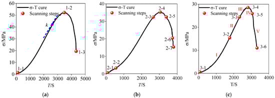 Unlike the sudden brittle failure observed in homogeneous rocks [], natural sandstone usually undergoes progressive failure due to the existence of its anisotropic microstructure. Key scanning locations were strategically selected at distinct loading stages to monitor microstructural evolution. Group 1 specimens underwent CT scanning at three critical stress–strain curve inflection points: loading initiation (1-1), peak stress (1-2), and failure (1-3) (Figure 5a). The parameter k was defined as the slope of the linear elastic region in the stress-time curve, which quantifies the sandstone’s resistance to elastic deformation under uniaxial compression. Considering the marked mesostructural disparities observed in Group 1, Group 2 specimens received 1-2 additional scans near each of the three key points identified in Group 1. Specific additions included point 2-2 (near loading initiation 2-1), dual points 2-3/2-5 (adjacent to peak 2-4), and point 2-6 (close to failure 2-7) (Figure 5b). Accounting for crack propagation, the fracture process of Group 3 specimens was segmented into five loading stages (compression I, elastic II, yield III, pre-failure IV, instability V) with six stress levels, informed by Group 1/2 stress–strain curves and CT imagery. The six stress levels aligned with six real-time CT scanning nodes (3-1 to 3-6) illustrated in Figure 5c []. Integrated CT real-time scanning and SEM experiments were conducted at critical transition points during Group 3’s continuous uniaxial compression and AE monitoring.
