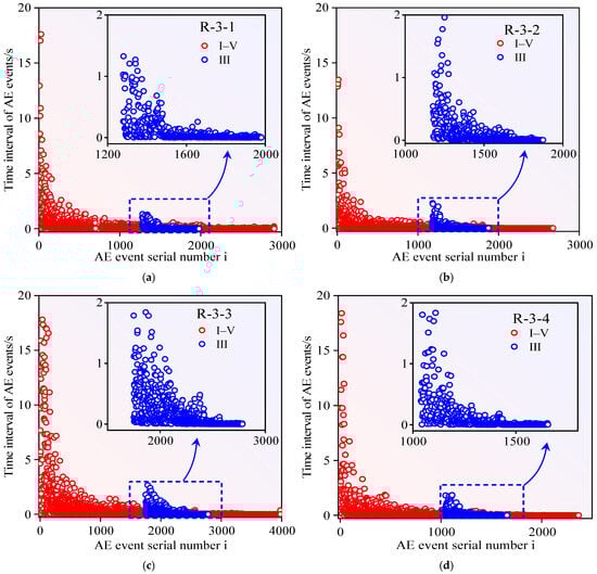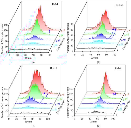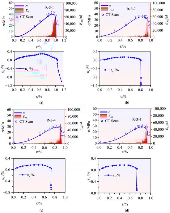 Stress–strain responses and AE activity patterns during fracture development of sandstone specimens: (a) Specimen R-3-1; (b) Specimen R-3-2; (c) Specimen R-3-3; (d) Specimen R-3-4.