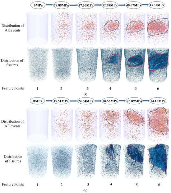 Spatiotemporal evolution of AE events and crack networks during progressive damage evolution in sandstone specimens: (a) Specimen R-3-1; (b) Specimen R-3-3.