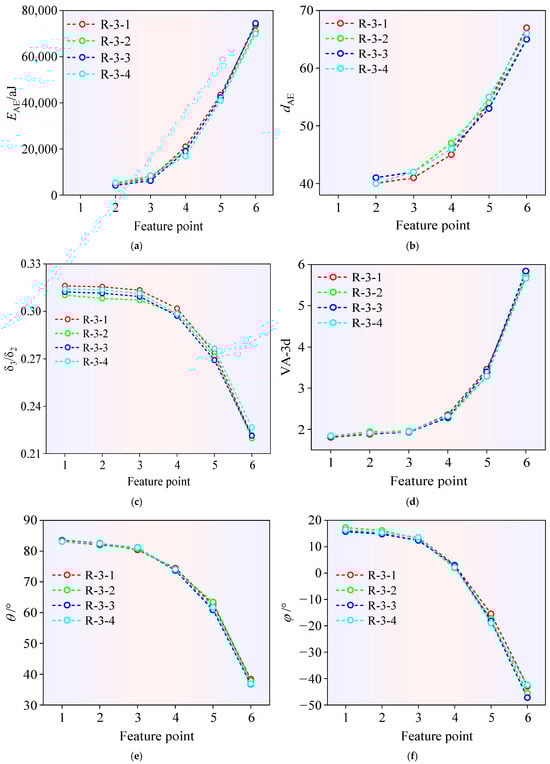 Evolutionary patterns of AE signal parameters and crack morphology during the loading process of each monitoring feature point: (a) AE signal parameter ; (b) AE signal amplitude ; (c) crack morphology parameter ; (d) crack morphology parameter VA-3d; (e) crack morphology parameter ; (f) crack morphology parameter .