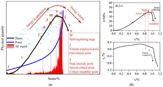 Sandstone exhibiting self-organized criticality undergoes damage progression characterized by stage-dependent critical thresholds (Figure 9). The yield phase (Stage III) represents the self-organization regime. First critical threshold (volume expansion point) initiates microcrack nucleation from distributed microdamage. Second critical threshold (peak strength) drives microcrack coalescence into macroscale fractures. During pre-yield stages (I–II), stress accumulates through quasi-static deformation. Approaching Monitoring Point 3, strain rate escalation indicates damage localization. Volumetric strain (obtained from axial and radial strain gauges) transitions from compressive to dilative, accompanied by accelerated AE-microcrack coevolution. Crack propagation persists autonomously under constant-load conditions, demonstrating autocatalytic failure. Post Stage III, the system transitions to a meta-stable configuration. At Monitoring Point 4, stress intensification triggers macrocrack percolation. Localized damage zones evolve into stress singularities, enabling instantaneous energy release. Final fracture planes emerge through catastrophic coalescence of dominant cracks. Stage III serves as the instability precursor through self-organized damage patterning. Stage IV culminates in irreversible structural collapse. Final instability (Point 6) occurs substantially later than peak strength attainment (Point 4). Damage progression transitions from disordered low-energy states to organized high-energy configurations. Energy accumulates quasi-statically during early phases, whereas post-critical energy dissipation occurs catastrophically. Material heterogeneity induces nonlinear mechanical responses, driving self-organized damage evolution. Critical thresholds emerge at self-organization maturity. Self-organization patterns provide predictive signatures for impending instability. Thus, Stage III establishes the failure precursor framework.