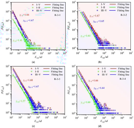 Power–law scaling of acoustic emission signals during progressive loading (I–V): (a) -, (b) -, (c) - and (d) -.