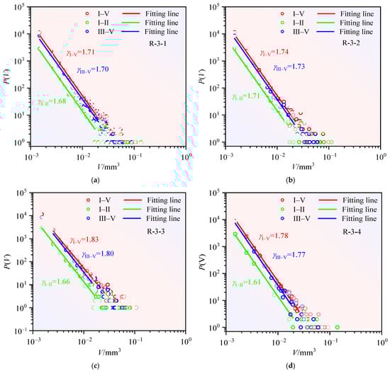 where is the lower intercept of the pore volume distribution and is the critical exponent of the pore volume distribution. Figure 10 and Figure 11 present power–law distributions characterizing acoustic emission (AE) energy and pore volume evolution across three distinct loading phases: initial (I–II), terminal (III–V), and complete (I–V) regimes. Table 4 quantifies these regimes through their respective power–law exponents. Distinct probability density profiles and critical scaling exponents define each phase’s mechanical signature.