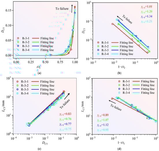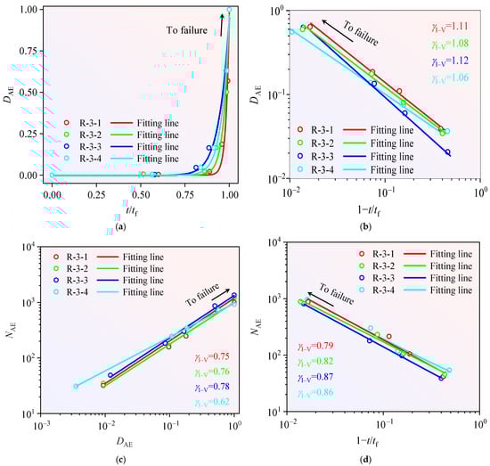 Although nominally homogeneous sandstone samples were selected to minimize mechanical heterogeneity, natural sandstone inherently exhibits intrinsic heterogeneity. This inherent heterogeneity, though minimized in our experimental preparation, still plays a significant role in the damage evolution and fracture mechanisms of sandstone. Figure 12a demonstrates that parameter exhibits power–law correlation with throughout the damage-fracture progression. This correlation is quantified through power–law scaling exponent (), which relates to loading-rate dependency () as formulated: