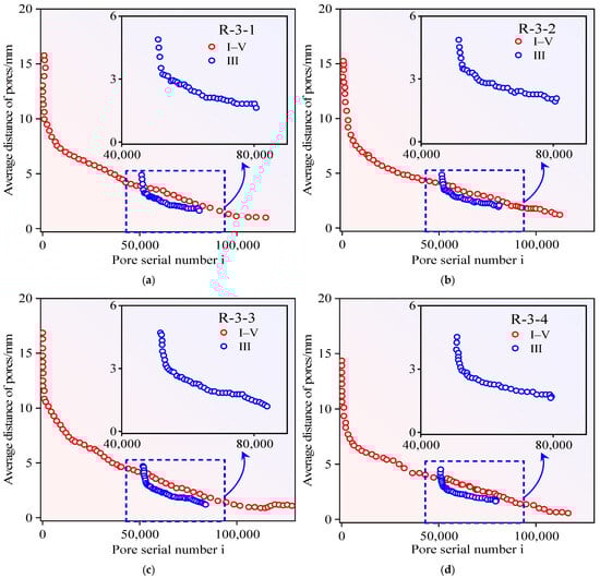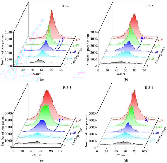 Power–law scaling of pore structure during progressive loading (I–V): (a) -, (b) -, (c) - and (d) -.