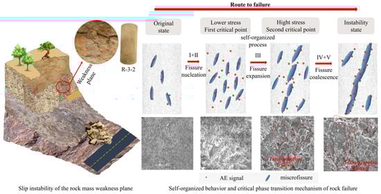 Multiscale framework depicting then self-organized criticality evolution, phase transition mechanics, progressive fracturing mechanisms within rock mass weakness planes.
