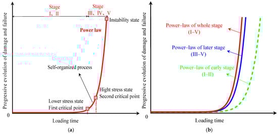 (a) Progressive sandstone damage–failure continuum follows second-order power–law behavior. (b) Late-stage fracture evolution (III–V) exhibits closer alignment with complete loading history (I–V) than early-stage patterns (I–II).