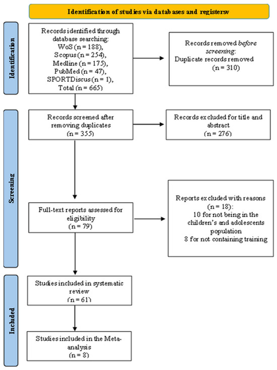 The process of study identification and selection is described in Figure 1, following the PRISMA methodology. The systematic search in electronic databases yielded a total of 665 records. After removing 310 duplicates, 355 titles and abstracts were screened, of which 276 were excluded for not meeting the eligibility criteria. Subsequently, 79 full-text articles were assessed. Of these, 18 were excluded for various reasons, including populations outside the defined age range or the absence of a structured physical intervention. Finally, sixty-one studies were included in the qualitative synthesis (systematic review), and of these, eight met the methodological and statistical criteria to be included in the meta-analysis.