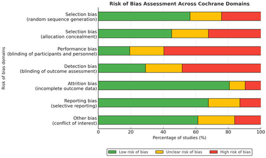 The methodological assessment of the 61 studies included [40,41,42,43,44,45,46,47,48,49,50,51,52,53,54,55,56,57,58,59,60,61,62,63,64,65,66,67,68,69,70,71,72,73,74,75,76,77,78,79,80,81,82,83,84,85,86,87,88,89,90,91,92,93,94,95,96,97,98,99,100] in this review revealed significant differences in the quality of design and in how procedures were reported. Regarding selection bias, approximately half of the studies clearly described how they generated the random sequence—among them, Hammami et al. [65] and Aloui et al. [42]—while others, such as Zakas et al. [100] and Mascarenhas et al. [81], did not provide sufficient information, raising concerns about the validity of this process. A similar issue occurred with allocation concealment, which was poorly detailed in most studies, making it difficult to accurately evaluate this criterion. Performance bias related to the blinding of participants and personnel was among the most common. In many studies, such as those by Haddad et al. [63] and Pancar et al. [88], no clear masking mechanisms were implemented, whereas only a few, such as Prieske et al. [91], reported specific procedures to control for this type of bias. Detection bias, associated with the blinding of outcome assessors, also showed variability: Gaamouri et al. [58] adequately reported this aspect, while studies such as Gorostiaga et al. [62] failed to mention it.