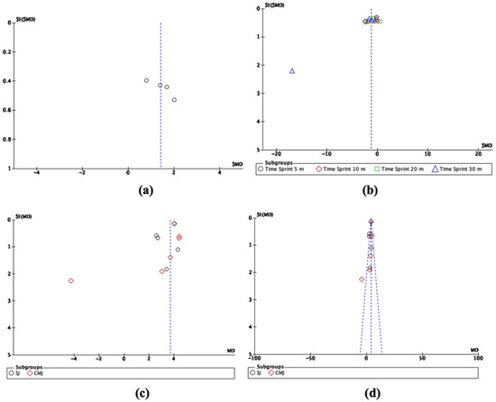Egger’s analysis suggested that the primary variables evaluated in the studies that were part of the meta-analysis showed publication bias after plyometric training: (a) peak power: z = 5.51, p < 0.00001; (b) time sprint: z = 3.81, p = 0.0001; (c) jump height: z = 15.09, p < 0.00001; and (d) effect of elastic band training on jump height: z = 10.05, p < 0.00001 (Figure 3).