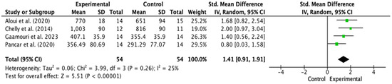 Four studies were included in the meta-analysis to evaluate the effect of plyometric training on peak power in handball players. The analysis showed a statistically significant effect in favor of the experimental group (SMD = 1.41; 95% CI: 0.91 to 1.91; p < 0.00001), indicating that the plyometric intervention led to substantial improvements in peak power output compared to the control group. The individual effect sizes of the studies are presented in Figure 4, ranging from 0.80 to 2.00. The study by Chelly et al. [52] reported the highest individual effect (SMD = 2.00; 95% CI: 0.97 to 3.04), followed by Aloui et al. [42] (SMD = 1.68; 95% CI: 0.82 to 2.54), while Pancar et al. [88] reported the lowest effect (SMD = 0.80; 95% CI: 0.03 to 1.58). All studies consistently favored the experimental group. Heterogeneity among studies was low (I2 = 25%; Chi2 = 3.99, df = 3; p = 0.26), indicating acceptable variability across individual results. The Tau2 value was 0.06, supporting the stability of the observed effect size. Overall, the results suggest that plyometric training is an effective intervention for improving peak power in handball players, demonstrating high consistency across studies and positive effects in all comparisons analyzed.