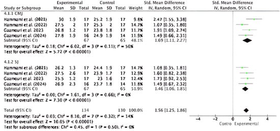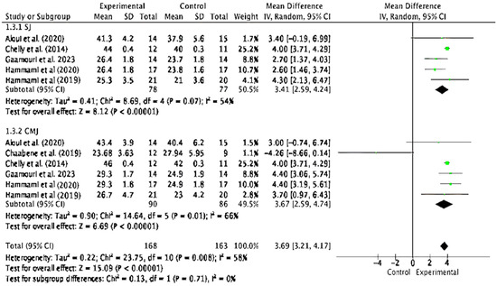 A total of eleven comparisons were included to evaluate the effect of plyometric training on vertical jump performance in handball players, specifically in two tests: countermovement jump (CMJ) and squat jump (SJ). The analysis presented in Figure 6 showed a statistically significant effect in favor of the experimental group (SMD = 3.69; 95% CI: 3.21 to 4.17; p < 0.00001), indicating a substantial improvement in jump performance following the plyometric intervention. The subgroup analysis by jump type revealed significant effects in both cases. For the SJ, an effect size of 3.41 was found (95% CI: 2.59 to 4.24; p < 0.00001) with moderate heterogeneity (I2 = 54%). Similarly, for the CMJ, the effect size was 3.67 (95% CI: 2.59 to 4.74; p < 0.00001), also with moderate heterogeneity (I2 = 66%). The test for subgroup differences was not significant (Chi2 = 0.13; p = 0.71), suggesting that both jump types respond similarly to the intervention. The studies by Chelly et al. [52], Hammami et al. [65], and Gaamouri et al. [59] consistently contributed positive effects in both jump types, strengthening the overall effect. The global heterogeneity of the analysis was moderate (I2 = 58%), supporting the consistency of the findings despite the methodological diversity among the studies.