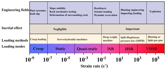 The mechanical properties of rock masses exhibit significant variations depending on burial depth, dynamic disturbances, and loading paths []. Dynamic loading intensities can be categorized into six regimes based on strain rate levels [,], as shown in Figure 1. Under both creep (<10−7 s−1) and static loading (10−7–10−4 s−1) conditions, the compressive strength of rocks typically exhibits strain rate independence, with engineering fields encompassing fault slip, slope stability, and long-term stability of surrounding rock in underground caverns. In quasi-static regimes (10−4–10−1 s−1), there is a gradual increase in compressive strength with strain rate increases (distinct from inertia-dominated mechanisms), correlating with engineering scenarios such as seismic loads (10−3–10−1 s−1) [], rockburst (1.5 × 10−3–1.7 × 10−1 s−1) [], and mining tremors (1.6 × 10−3–1.6 × 10−1 s−1) []. When the strain rate exceeds 10−1 s−1, transitional rate dependency governed by inertial effects becomes prominent in rock compressive strength, observed in blasting engineering, impact loading, and explosions. This analysis reveals that the compressive strength of rocks under quasi-static loading exhibits distinct deviations from both conventional static loading conditions and dynamic loading regimes (e.g., explosive/shock wave scenarios), highlighting their strain rate dependency []. Nevertheless, current engineering practices predominantly employ static mechanical parameters or empirically adjusted values (typically increased by 30%) based on early foreign experimental data to determine dynamic parameters []. This oversimplified approach, neglecting project-specific dynamic loading environments, substantially elevates the risk of rock mass instability.