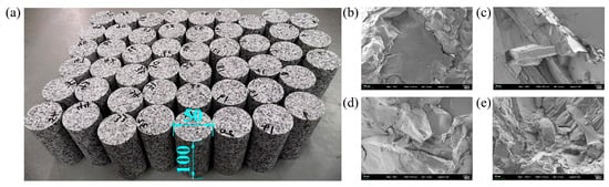 Granite specimens in this study: (a) prepared rock specimens (unit: mm); (b) 100× SEM photograph; (c) 300× SEM photograph; (d) 500× SEM photograph; (e) 1000× SEM photograph.