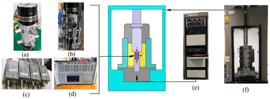 Lab testing equipment used for triaxial quasi-static loading with AE monitoring. ((a) AE sensors on the specimens; (b) diametral displacement LVDT; (c) AE signal amplifiers; (d) AE monitoring system; (e) servo-control system; (f) MTS815 rock testing system and triaxial cell).