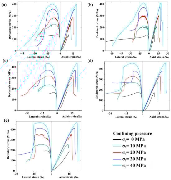 Stress–strain curves of granite specimens in triaxial compression under different strain rates ((a) 10−6 s−1; (b) 10−5 s−1; (c) 10−4 s−1; (d) 10−3 s−1; (e) 10−2 s−1).