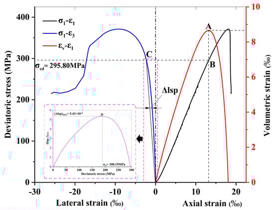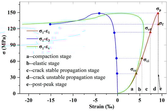 - The peak point of the axial stress–volumetric strain curve is the volumetric dilantancy point (point A in Figure 6), and the corresponding axial stress value is σcd;