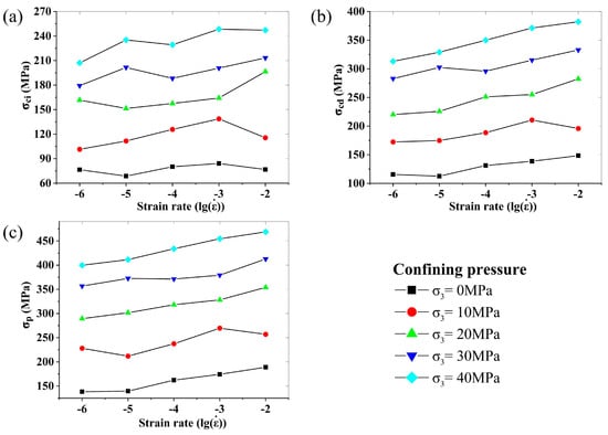 The relationship between characteristic stresses and the logarithm of strain rate under triaxial loading ((a) σci; (b) σcd; (c) σp).