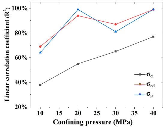 Table 3 provides the linear regression equations between characteristic stresses and the logarithm of the strain rate, while Figure 8 illustrates the relationship between linear correlation coefficients and the confining pressure. The results reveal three key patterns: (1) the linear correlation coefficients for σci, σcd, and σp progressively increase with elevated confining pressure; (2) under identical confining pressure conditions, σci exhibits significantly lower correlation coefficients compared to σcd and σp; (3) the correlation coefficients of σcd and σp demonstrate consistent variation trends with confining pressure and maintain comparable magnitudes across the experimental pressure range.