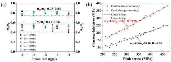 Figure 9a demonstrates a negligible correlation between characteristic stress ratios (σci/σp, σcd/σp) and the logarithm of the strain rate, with respective fluctuation ranges of 0.41–0.56 and 0.75–0.84. The σci/σp ratio exhibits a 25% greater dispersion amplitude compared to σcd/σp. Statistical analysis under triaxial quasi-static conditions (confining pressure: 0–40 MPa; strain rate: 10−6–10−2 s−1) reveals strong linear correlations between σci-σp and σcd-σp pairs, as shown in Figure 9b, with determination coefficients R2 = 0.96 and 0.99, respectively. The derived empirical slopes (σci/σp = 0.58; σcd/σp = 0.85) approximate the upper bounds of their corresponding fluctuation ranges in Figure 9a. Previous studies report σci/σp and σcd/σp under uniaxial compression in quasi-static regime: 0.60 and 0.80 for granite [] and 0.55 and 0.86 for soil–rock mixtures []. These results indicate that stress ratios do not change with the increase in strain rate, suggesting they may represent intrinsic material properties that are independent of loading conditions. In addition, the established empirical relations σci = 0.58σp and σcd = 0.85σp enable a practical estimation of critical stress thresholds directly from σp measurements, providing theoretical foundations for the rapid field assessment of the rock mass failure potential.