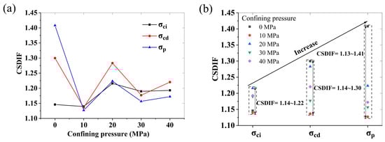 The relationship between CSDIF and confining pressures. ((a): CSDIF-confining pressure; (b): CSDIF of characteristic stresses).