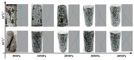 Figure 11 illustrates the macroscopic failure morphology of granite specimens under confining pressures over a wide range of strain rates (10−6 to 10−2 s−1). The experimental results demonstrate three principal findings: (1) At the strain rate of 10−6 s−1, specimens under a 0 MPa confining pressure exhibit vertical fracture planes perpendicular to the end surfaces, representing typical splitting failure. When the confining pressure increases to 10 MPa, Y-shaped fracture patterns initiate from the specimen mid-height with subsequent bifurcation, maintaining geometric stability under elevated confining pressures, indicative of a shear failure mechanism. (2) Under uniaxial conditions (0 MPa) at a strain rate of 10−2 s−1, the rock specimen develops a single inclined shear plane, with fracture planes wider than those observed under static loading conditions (10−6 s−1). Additionally, the quasi-static regime (10−2 s−1) produces a higher volume of pulverized rock debris observed on the fractured surfaces compared to static loading, demonstrating fundamental morphological differences compared to the static loading condition (10−6 s−1). This result aligns with existing research [] showing strain rate-induced transition from axial splitting to shear-dominated macro-fracture pattern with increasing strain rate in granite. (3) At a 10−6 s−1 strain rate with confining pressures increasing from 10 MPa to 40 MPa, a progressive failure pattern evolution is observed: Y-shaped fractures persist at 10–20 MPa, multi-branching fractures emerge at 30 MPa, and characteristic X-conjugate shear bands form at 40 MPa. Systematic analysis reveals that within the triaxial quasi-static loading regime, the macroscopic failure modes of granite are governed by strain rate-confining pressure coupling effects, following a consistent transition rule: increasing strain rates and confining pressures promote gradual evolution from hybrid tensile–shear failure to shear-dominated failure mechanisms.
