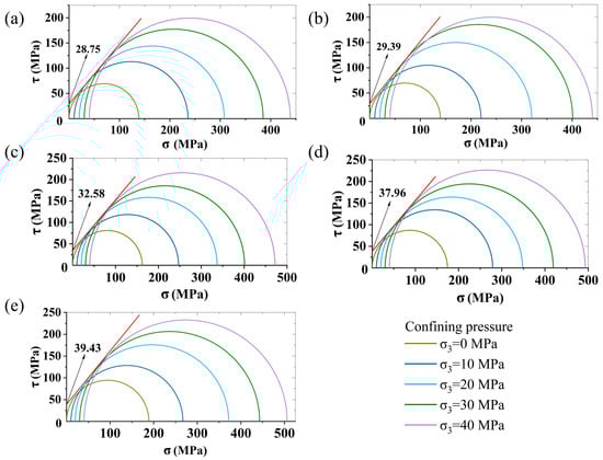 Mohr stress circle and strength envelope curves under different strain rates ((a)-10−6 s−1; (b)-10−5 s−1; (c)-10−4 s−1; (d)-10−3 s−1; (e)-10−2 s−1).