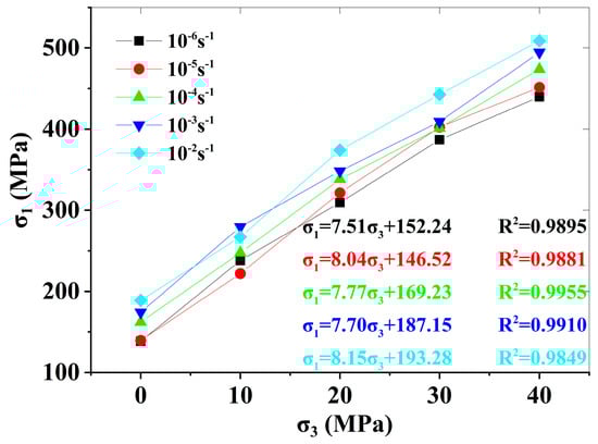 The relationship between minimum principal stress and maximum principal stress of rock specimen under different strain rates.