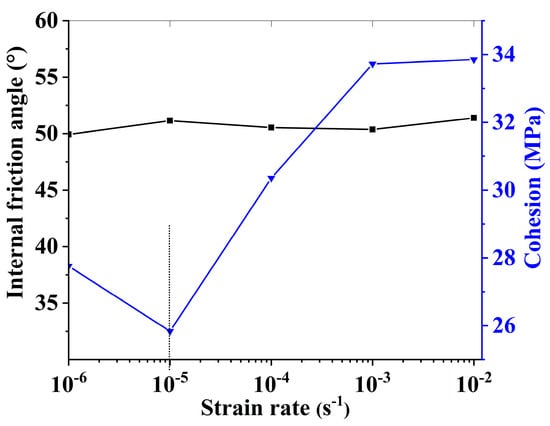 Figure 15 delineates the evolution of minor principal stress and major principal stress relationships under varying strain rates. Experimental data demonstrate that the compressive strength exhibits significant enhancement with increasing strain rates and confining pressures, where the confining pressure constitutes the predominant contribution to strength improvement. Linear regression analysis of σ1-σ3 curves (fitting equations shown in Figure 15) reveals strict linear dependence between principal stresses across the quasi-static loading regime, supported by correlation coefficient values (R2 > 0.98) at all tested strain rates. Parameter calculations (Table 5) via Equations (9) and (10) show that cohesion increases from 27.76 MPa to 33.85 MPa (Δc = 6.09 MPa) as the strain rate elevates from 10−6 to 10−2 s−1, while the internal friction angle shows minimal variation from 49.93° to 51.39° (Δφ = 1.46°). When normalized to the reference strain rate of 10−5 s−1, cohesion demonstrates a 31% increase (Δc = 8.01 MPa), contrasting with the stable internal friction angle, as shown in Figure 16. These quantitative findings confirm that dynamic strength enhancement principally originates from cohesion evolution, with subsequent sections focusing on establishing the relationship between cohesion and the strain rate.