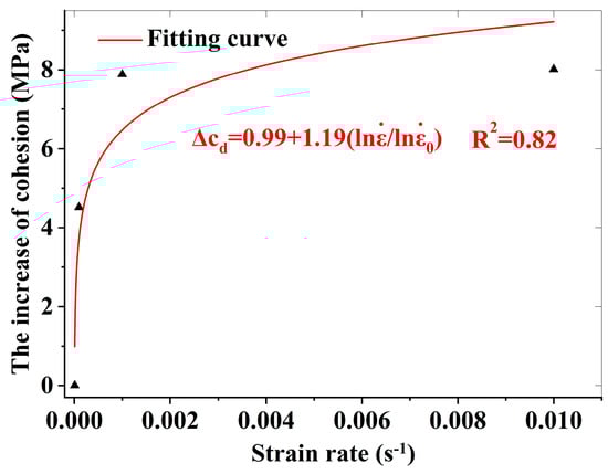 Given the established dominance of cohesion enhancement in strain rate effects, we extend this formulation to characterize dynamic cohesion evolution. Defining static strain rate as 10−5 s−1 and dynamic cohesion increase (Δcd) as the difference between dynamic and static cohesion, Figure 17 reveals nonlinear growth patterns: Δcd increases rapidly at 10−5–10−3 s−1 before plateauing. The fitted relationship is