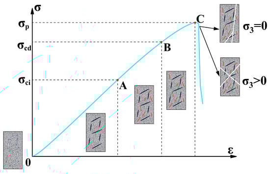 The compressive deformation and failure of rock materials intrinsically represent a continuum of progressive evolution, characterized by the nucleation, propagation, and coalescence of internal microcracks []. Classical theoretical models [] delineate the stress–strain response into five characteristic phases, as illustrated in Figure 5. The initial compaction stage manifests a concave–upward curve morphology where the tangent modulus progressively increases with axial loading, indicative of the gradual closure of pre-existing fractures. This transitions into a linear elastic deformation phase marked by a near-ideal proportional relationship between stress and strain, the slope of which quantifies the rock’s elastic modulus []. Upon reaching σci, the system enters a stable crack propagation regime characterized by randomly distributed nascent microcracks lacking dominant growth trajectories. Exceeding σcd triggers unstable crack growth, exhibiting preferential orientation alignment and concomitant volumetric dilation. Macroscopic fracture plane formation occurs subsequent to attaining σp of the stress–strain curve. These critical thresholds—σci governing crack nucleation, σcd signifying damage acceleration, and σp demarcating ultimate compressive strength—collectively define brittle behavioral attributes. Additionally, the characteristic stress ratios serve as pivotal indices for evaluating rock brittleness and failure mode transitions.