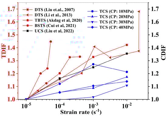 DIF of granite specimens under tensile and compressive loading conditions [,,,,]. (TDIF—tensile dynamic intensity factor; CDIF—compressive dynamic intensity factor; DTS—direct tensile strength; TBTS—three-point bending tensile strength; BSTS—Brazilian split tensile strength; UCS—uniaxial compressive strength; TCS—triaxial compressive strength; CP—confining pressure).