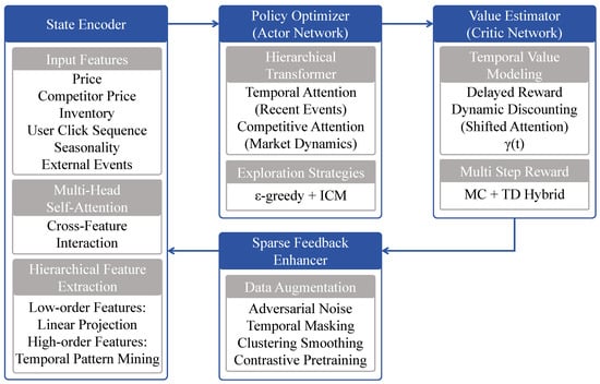 Overview of the proposed DRL framework for pricing-strategy generation. It includes a state encoder for multi-level feature extraction, a transformer-based policy optimizer with exploration mechanisms, a value estimator for delayed-reward modeling, and a sparse-feedback enhancer to improve training robustness.