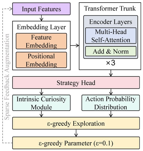 A modular DRL strategy-generation system was constructed, in which preprocessed temporal data features were initially processed by a state encoder for multi-level feature extraction. Cross-modal interactions were subsequently realized through multi-head self-attention mechanisms. A strategy optimizer then generated decision actions based on the encoded states, employing an -greedy strategy combined with an intrinsic motivation mechanism to facilitate exploration. Concurrently, a value estimator modeled future returns based on current states and actions using delayed modeling and dynamic discounting, with training signals optimized via multi-step mixed returns. To enhance feedback robustness, a sparse-enhancement module was introduced, which incorporated adversarial perturbation, temporal masking, and cluster smoothing for structural augmentation and prior training. All modules functioned cooperatively in a closed-loop configuration, enabling efficient generation and dynamic optimization of decision policies under high-dimensional states, as shown in Figure 1 and Table 2. The overall architecture follows an actor–critic paradigm based on the deep Q-network (DQN) framework. The policy network (actor) generates a stochastic action distribution through a softmax layer, while the value network (critic) estimates the Q-values using a multi-step return formulation. This design combines the sample efficiency and convergence stability of value-based learning with the flexibility of gradient-based policy optimization.