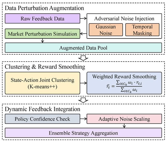 In large-scale data environments, behavioral feedback often exhibits high levels of sparsity and heterogeneity, particularly under conditions in which data recording is constrained by uneven user attention, short sampling intervals, or asynchronous event timing. These factors frequently result in missing or delayed supervisory signals, which can significantly undermine the accuracy of value estimation during training, amplify gradient propagation errors, and ultimately lead to policy degradation or convergence to suboptimal solutions. This issue critically impairs the model’s generalization and stability in complex environments. To address this, a sparse-feedback-enhancement module (reward denoising module) has been designed to improve robustness, generalizability, and exploratory capabilities under sparse-feedback conditions. This module integrates data perturbation augmentation, temporal masking, state–action clustering, and weighted return smoothing as core mechanisms, as shown in Figure 3.
