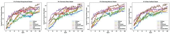 To ensure generalizability and stability, the dataset was divided using a temporal split strategy to prevent future information leakage inherent in standard random cross-validation schemes. Specifically, data collected from January to September 2023 were used for training, while data from October to December 2023 were reserved for testing. This setup simulates real-world deployment scenarios in which pricing strategies must generalize to future unseen market conditions. In addition, since the four behavior data subsets (i.e., browsing behavior, inventory status, product pricing records, and sales feedback) span different temporal ranges, each subset was treated as an independent experimental task. For each task, training and testing splits were performed within the respective subset’s available time range (e.g., browsing data from January–June were split into training on January–May and testing on June), thereby ensuring consistency in temporal ordering and eliminating the risk of information leakage over time. Several hyperparameters were configured to ensure effective training and convergence of the DRL model. The learning rate was set to 0.001, a value determined through empirical tuning to balance training speed and convergence stability. The discount factor was set to 0.99, reflecting a strong emphasis on long-term rewards and improving the stability and accuracy of pricing policies. The experience replay buffer size was configured to store 100,000 samples to ensure a rich and diverse history of interactions. A batch size of 64 was selected to balance computational efficiency and learning diversity across different states. The neural network architecture adopted in the deep Q-network (DQN) consisted of three fully connected layers, each containing 256 neurons. The ReLU activation function was applied to each layer to enhance the model’s capacity for nonlinear representation. The target network was updated every 10,000 steps during training to stabilize learning.