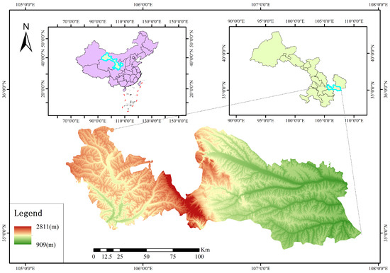 Situated in the southern region of the Loess Plateau of Longdong, in Lingtai County, Pingliang City, Gansu Province (Figure 1), the study area is a typical loess hilly-gully landform with a total area of and geographic coordinates ranging from 107°00′ to 107°57′ east longitude and 34°02′ to 34°23′ north latitude. The topography of the region is dominated by loess beam-pebble hills and erosion-accumulation valley plains. It has loess beams and a pebble hills base for the Cretaceous sandstone and gravel, the surface layer is covered with Malan loess, the formation of beams and pebbles interlace terrain, elevation is 910 to 1020 m, the gully is a V-shaped cut, depth is 20 to 150 m, a valley slope gradient of 15 to 40 degrees, and development of the gully and the intensive local collapse landslide. Erosion-accumulation of the river valley plains is distributed in the valley of the Daxi River and its tributaries, the development of river beds, river rambling beach, and multi-level terrace. The first and second terraces are flat and broad, while the third and fourth terraces are sporadically distributed and are base terraces, with a difference of 20 to 40 m in height between the terrace surfaces. Micro-geomorphology in the area is dominated by waterfall holes and gullies, with waterfall holes of 0.2–1.5 m in diameter, which are concentrated in the upper and middle slopes due to precipitation or irrigation seepage, and gullies have proliferated due to the frequency of torrential rains in recent years, aggravating the erosion and damage of slopes.