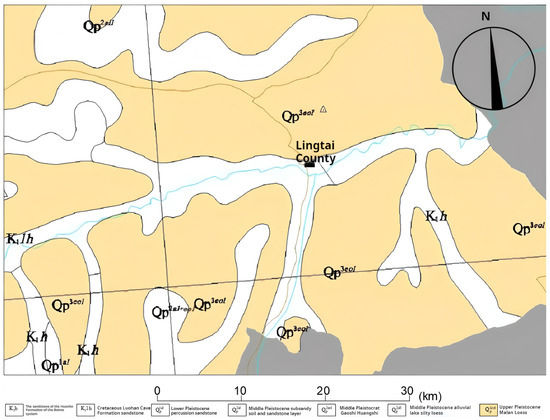 According to the investigations of relevant literature [20], the study area is located in the stable tectonic unit of the southwestern edge of the Ordos Basin, with weak tectonic activities, no regional rupture, and the development of five gentle folds (four oblique and one dorsal). The new tectonic movement is dominated by intermittent uplift, forming the four-level terraces and bedrock outcrops in the river valley. Earthquakes are controlled by strong peripheral earthquakes, and the 1920 Haiyuan 8.5-magnitude earthquake triggered secondary disasters. The regional seismic defense intensity is VII degrees (peak acceleration of ground shaking 0.10 g), and the Earth’s crust is stable as a whole, but the loess slopes are weak in seismic performance, so it is necessary to carry out the analysis of anti-slip stability and reinforcement design under seismic conditions.