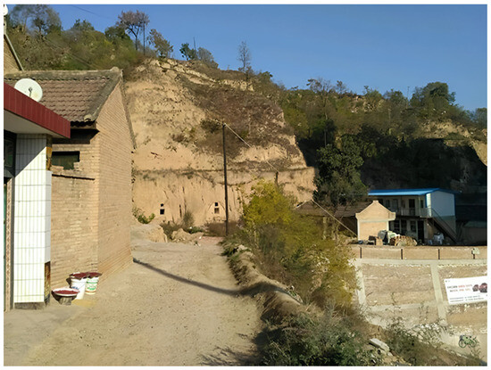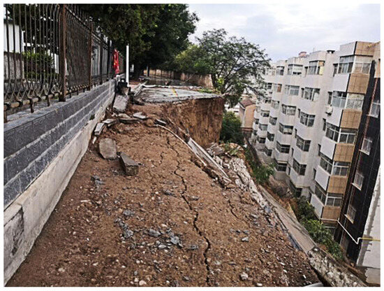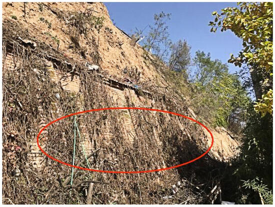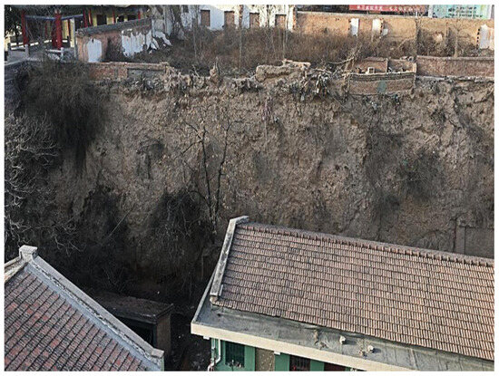 In the study area on the south side of Jingshan Mountain in Lingtai County, the risk of geological disasters has been significantly exacerbated by human engineering activities, which are mainly reflected in slope cutting, green irrigation, and air-raid shelters. Due to the large number of outsiders in the densely populated area, a large number of slopes were cut to build houses, which destroyed the original slope, increased the slope and slope weight, and directly destroyed the stability of the original slope. This is shown in Figure 4. The greening irrigation on the top of the slope causes water to infiltrate along the vertical joints and sinkholes, which raises the groundwater level weakens the shear strength of rock and soil, and weakens the stability of the slope. In addition, although the remaining air-raid shelters have been blocked, there are still hidden seepage channels, and the mechanical properties of the rock and soil around the caves are accelerated by water intrusion during rainfall. These activities are the core anthropogenic drivers of slope instability by altering the topographic structure, permeability conditions, and geophysical properties. This is shown in Figure 5.