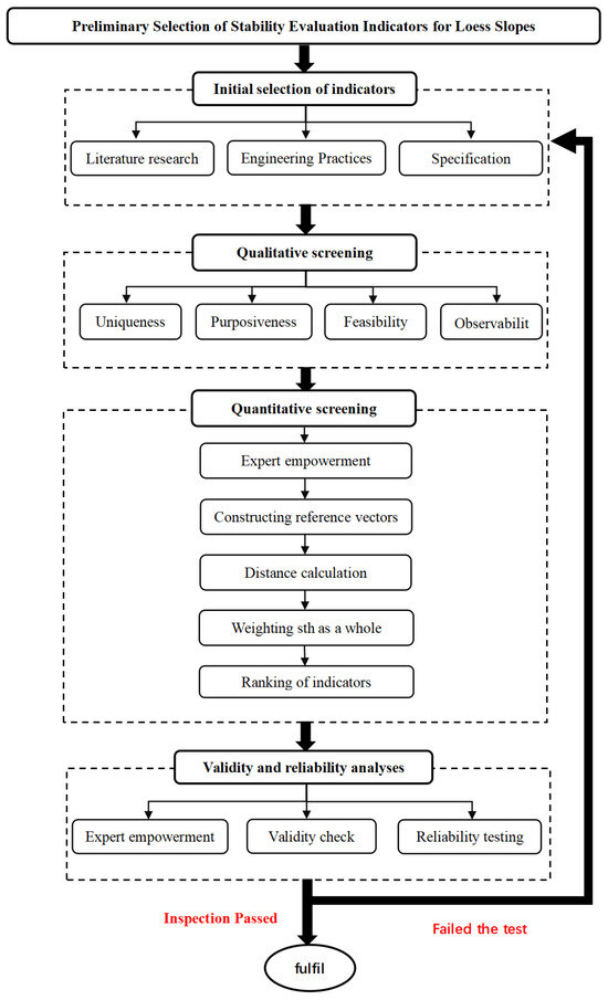 This study focuses on the stability of loess slopes and proposes the four-step method of “preliminary selection, qualitative screening, quantitative screening, and verification” to construct the slope stability evaluation index system and combines the improved grey correlation model with the statistical validation method to systematically analyze the validity and reliability of the indexes. The specific operation process is shown in Figure 6.