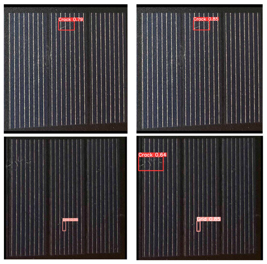 Figure 6. Among them, the Precision rate for the spot is as high as 0.943, while the rates for crack and grid reach 0.891 and 0.882, respectively, indicating that the detection results are highly reliable, with an extremely low false detection rate. At the same time, the model also has strong Recall capabilities. The Recall rates for the three types of defects all exceed 0.85, proving that the model can effectively capture the vast majority of defects and significantly reduce the risk of missed detections. Under the conventional IoU threshold (0.5), the mAP50 for the grid and spot both exceed 0.9, and cracks are close to this level. This demonstrates the model’s balanced advantages in detection accuracy and coverage. The model maintains stable performance for different types of defects, verifying its practicality and generalization ability in complex industrial quality inspection scenarios. In summary, the EER-DETR model shows high accuracy, strong robustness, and comprehensiveness in detecting defects on photovoltaic panels, providing efficient and reliable technical support for industrial automated quality inspection.