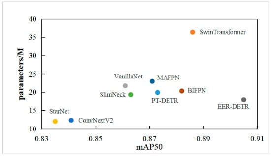 Improvements and comparisons on different structures of the neck part were also made. After improving RT-DETR with SlimNeck, its parameters were reduced and the computational complexity was lower. However, there is still a gap in terms of the Precision, Recall, mAP50 and mAP50-90 indicators compared with EER-DETR. Using mAP for comparison, EER-DETR increased by 4.2% compared with SlimNeck and by 3.4% and 2.3%, respectively, compared with MAFPN and BIFPN. Meanwhile, our model has the lowest parameter quantity. It can be clearly seen from