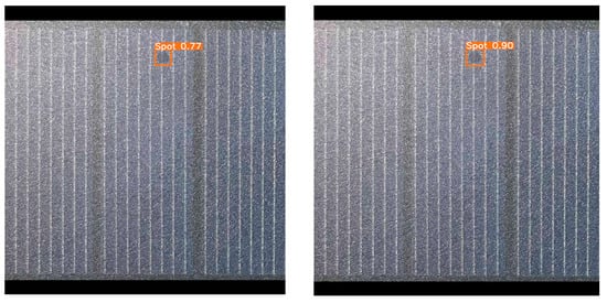 Our EER-DETR model has demonstrated excellent performance in detecting three types of defects, and the verification result is shown in Figure 6. Among them, the Precision rate for the spot is as high as 0.943, while the rates for crack and grid reach 0.891 and 0.882, respectively, indicating that the detection results are highly reliable, with an extremely low false detection rate. At the same time, the model also has strong Recall capabilities. The Recall rates for the three types of defects all exceed 0.85, proving that the model can effectively capture the vast majority of defects and significantly reduce the risk of missed detections. Under the conventional IoU threshold (0.5), the mAP50 for the grid and spot both exceed 0.9, and cracks are close to this level. This demonstrates the model’s balanced advantages in detection accuracy and coverage. The model maintains stable performance for different types of defects, verifying its practicality and generalization ability in complex industrial quality inspection scenarios. In summary, the EER-DETR model shows high accuracy, strong robustness, and comprehensiveness in detecting defects on photovoltaic panels, providing efficient and reliable technical support for industrial automated quality inspection.