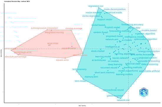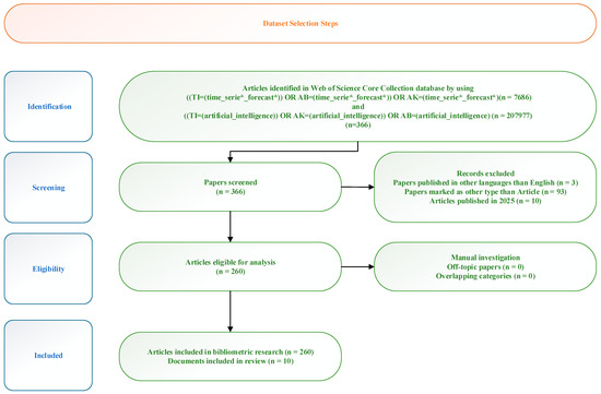 The first step consists of dataset Identification, where the documents are related to time series forecasting and artificial intelligence. The keywords such as “time_serie*_forecast” and “artificial_intelligence” were applied to the existing WoS, searching in abstracts (AB), titles (TI), and authors’ keywords (AK) in the most representative papers. In total, there were 207,977 papers related to artificial intelligence and 7686 papers related to time series forecasting. In order to investigate the common documents, a filter was applied, resulting in a total of 366 documents that contained artificial intelligence and time series forecasting. It should be mentioned that the query was performed using the singular forms of the filtering keywords, in order to be able to include also the plural forms of the terms by adding an asterisk (“*”) at the end of the singular form. At the same time, the focus was to include also the combination of terms, rather than including only the individual forms, grouping the words using the underline (“_”). Thanks to the underline, the results contained sequences of the search terms and not just the individual forms. For instance, the keywords “artificial_intelligence” written in this form extracted from the database the papers that had “artificial intelligence” as a sequence either in the abstract, authors’ keywords, or titles, and not only the individual term of “artificial” or “intelligence”.