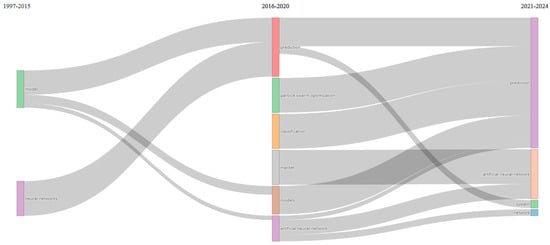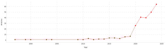 Figure 2 details the yearly scientific production on the time series forecast and AI domains, between 1997 and 2024. During the timespan, a positive trend could be observed, especially starting with the 2019–2020 period. The increase in the number of papers starting with this period could have two main reasons. The first one could be related to the mainstream adoption of the transformer models across various disciplines as well as the creation of new transformer variants for time series forecasting, with impacts on the improvement of long-term forecasting accuracy. On the other hand, some of the increase could be due to the general trend observed in research by Ofer et al. [39], that underlined that the number of scientific papers had increased in recent decades. The increase in the number of publications could have multiple causes, such as, but not limited to, better automated data indexing observed through the use of various databases [39], the use of the keyword annotation scheme by research subjects [39], the advancements in computer science [39], the growth in research and development expenditures [40], and the overall number of researchers in the field [40].