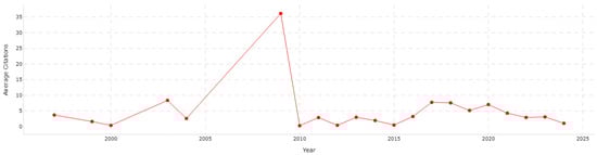Figure 3 illustrates the average citations per year on the domains of time series and AI. The first year with citations was 1997, with an average of 3.72 citations. A significant spike was observed in 2009, where the average citations per year reached 36.12, when the most cited article, with a total of 614 citations, was published by Wang [44]. During the remaining period, the mean citations were between 1 and 7 per year.