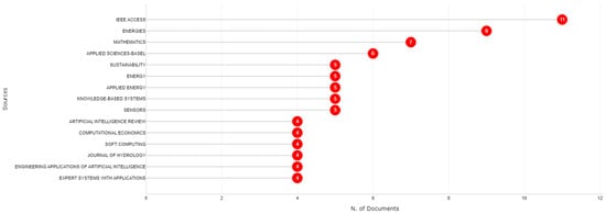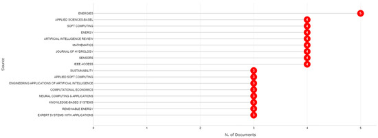 In our case, the most relevant source was Energies, with an H-index value of 5 and a G-index value of 9, followed by Applied Sciences-Basel, with an H-index value of 4 and a G-index value of 6. In third place was Artificial Intelligence Review, with an H-index of 4 and a G-index of 4. Energy, IEEE Access, Journal of Hydrology, Mathematics, Sensors, and Soft Computing each had an H-index value of 4, while Applied Soft Computing, Engineering Applications of Artificial Intelligence, Computational Economics, Neural Computing & Applications, Knowledge-Based Systems, Renewable Energy, and Expert Systems with Applications had an H-index value of 3.