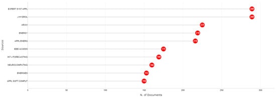 Figure 5 shows the 10 most crucial local journals based on the number of citations. In first place are two journals, Expert Systems with Applications and Journal of Hydrology, each with 289 citations, followed by ARXIV with 225 citations, Energy with 219 citations, and Applied Energy with 216 citations. IEEE Access had 175 citations and International Journal of Forecasting had a total of 169 citations, followed by Neurocomputing with 160 citations, Energies with 153 citations, and Applied Soft Computing with 150 citations. Shabani et al. [46] explored portfolio optimization using AI and discovered that Expert Systems with Applications was the journal with the highest number of publications, followed by Journal of Portfolio Management and IEEE Access. The rest of the journals had less impact and were not common in our outcome, demonstrating the variety of the domain and how the impact on the results changed if, during the extraction process, different filters were applied.