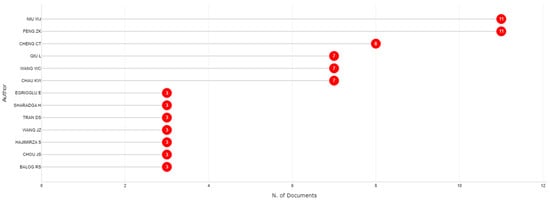 Figure 9 focuses on the major authors by taking into account the local citations. In first place are Feng ZK. and Niu WJ. with 11 citations each, while Cheng CT. is third with 8 citations, and Chau KW., Qiu L., and Wang WC., each have 7 citations. The last authors are Balog RS., Chou JS., Egrioglu E., Hajmirza S., Shardaga H., Tran DS., and Wang JZ., with 3 citations each.